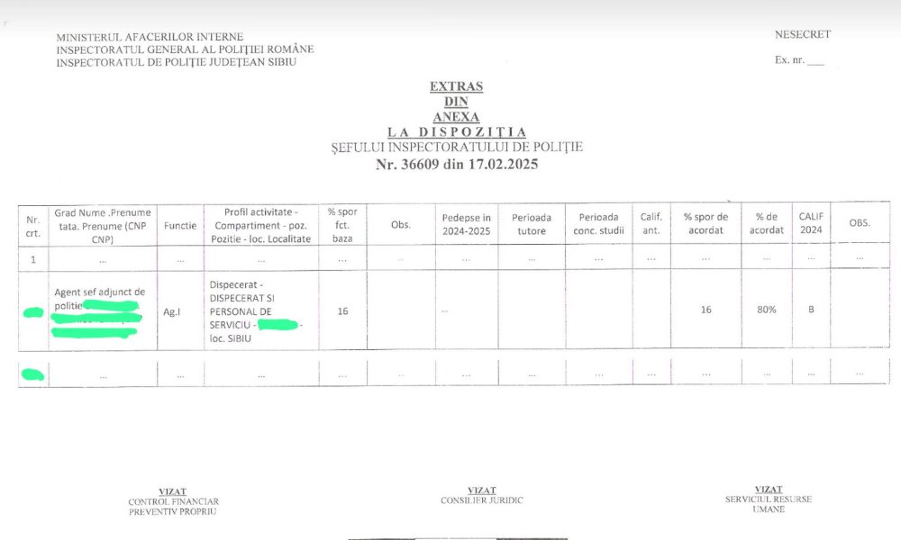 Extrasul din Dispoziția Șefului Inspectoratului de Poliție, Nr. 36609 din 17.02.2025, publicat de sindicat, confirmă în mod clar statutul „NESECRET” al documentului. Acesta detaliază acordarea unui spor pentru un „Agent șef adjunct de poliție” din cadrul dispeceratului IPJ Sibiu, indicând un „spor de acordat” de 16% și un „% de acordat” de 80%. Prezența acestei mențiuni „NESECRET” pe un document de decizie salarială vine în contradicție directă cu informațiile vehiculate până acum, demonstrând că procentele respective nu erau, de fapt, informații clasificate.