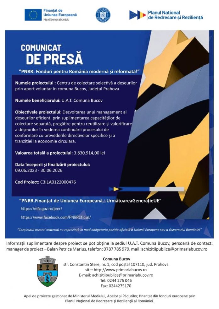 Articolul Comuna Bucov – „PNRR: Fonduri pentru România modernă și reformată” apare prima dată în Ziarul de Ploiesti, stiri Prahova.
