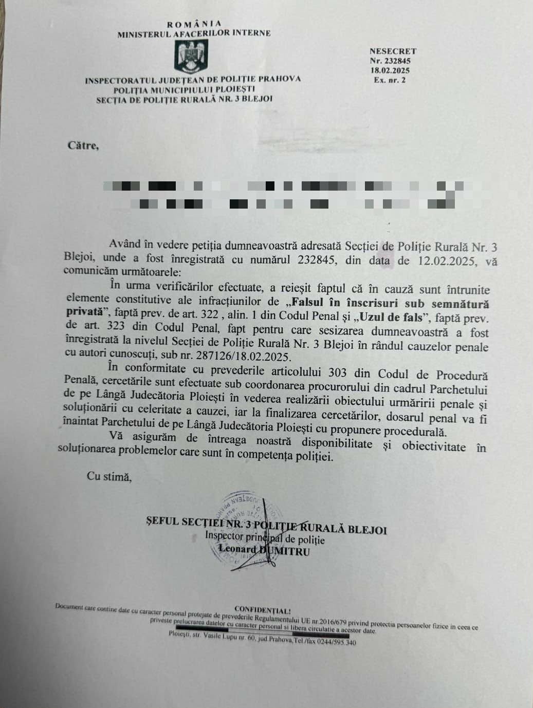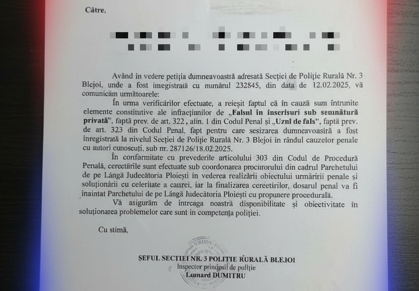 În fața acestei situații hilare, dar cu implicații legale serioase, organele de cercetare penală au fost sesizate. Pe 12 februarie 2025, o petiție ajungea la Secția nr. 3 Poliție Rurală Blejoi, din cadrul IPJ Prahova. Și, într-un moment de sclipire a sistemului, răspunsul a venit prompt, pe 18 februarie 2025. Prin adresa nr. 232845 [sursa: Adresa nr. 232845 a Secției 3 Poliție Rurală Blejoi, 18.02.2025], Poliția confirma, fără echivoc, că „în urma verificărilor efectuate, a reieșit faptul că în cauză sunt întrunite elemente constitutive ale infracțiunilor de ‘Fals în înscrisuri sub semnătură privată’, faptă prev. de art. 322, alin. 1 din Codul Penal și ‘Uzul de fals’, faptă prev. de art. 323 din Codul Penal”. Mai mult, dosarul penal este deja sub coordonarea unui procuror de la Parchetul de pe lângă Judecătoria Ploiești.