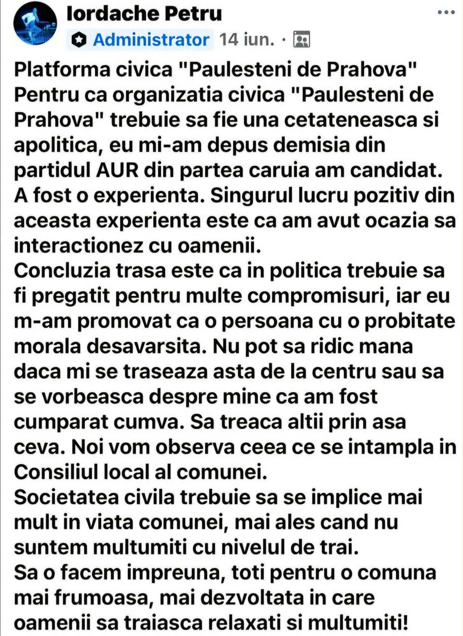 Totul a început pe 14 iunie 2024. Consilierul local Iordache Petru, ales sub stindardul AUR în Consiliul Local Păulești, își anunța, cu pompa specifică erei digitale, retragerea din partid. Într-o postare publică pe pagina sa de socializare [sursa: postare Facebook Iordache Petru, 14.06.2024], domnul consilier declara solemn că nu mai face parte din AUR, ci reprezintă acum „Platforma Civică Păuleștii de Prahova”. Motivația? Un manifest curat, aproape poetic, despre probitate morală, refuzul compromisurilor politice și dorința de a nu fi „cumpărat cumva”. O declarație de principii, menită să-l propulseze, probabil, în galeria eroilor locali.