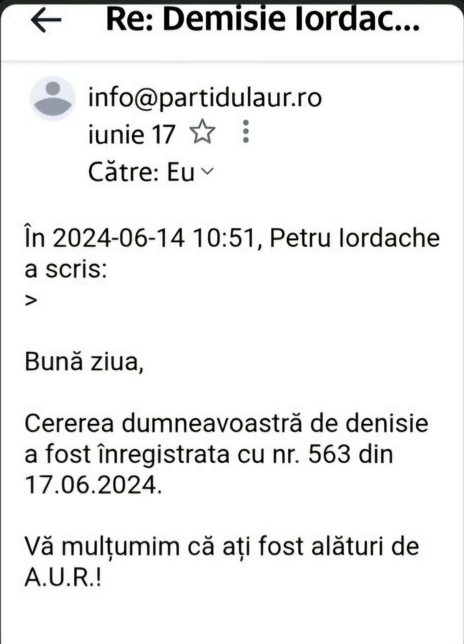 Și, pentru a sublinia gravitatea actului, demisia a fost înregistrată oficial de partid. Un e-mail de la „info@partidulaur.ro„, datat 17 iunie 2024 [sursa: e-mail de confirmare AUR, 17.06.2024], îi aducea la cunoștință domnului Iordache că „Cererea dumneavoastră de demisie a fost înregistrată cu nr. 563 din 17.06.2024”. Părea un adio irevocabil, un pas decisiv către o nouă formă de implicare civică, lipsită de „compromisurile” politicii de partid.