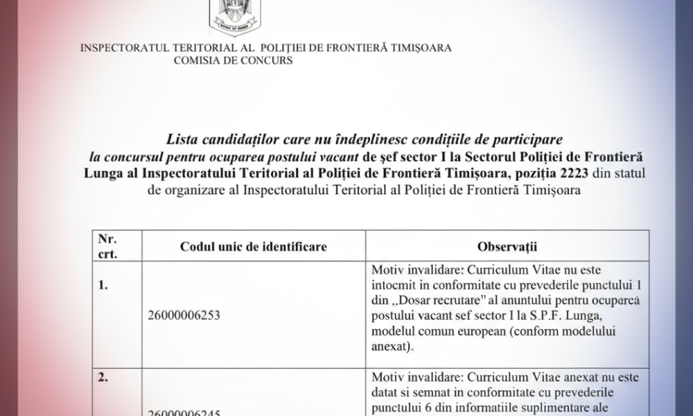 Imaginează-ți un document. Un Curriculum Vitae. Același document, identic, fără o virgulă lipsă, fără o literă schimbată. Acest CV a trecut cu brio patru concursuri anterioare, trei dintre ele chiar la același ITPF Timișoara și unul la marele Inspectorat General al Poliției de Frontieră. Patru! De fiecare dată, impecabil. Validat, aplaudat, trecut. Dar, surpriză! Pentru concursul de la Sectorul Poliției de Frontieră Lunga, acest CV devine, peste noapte, un fel de document eretic.