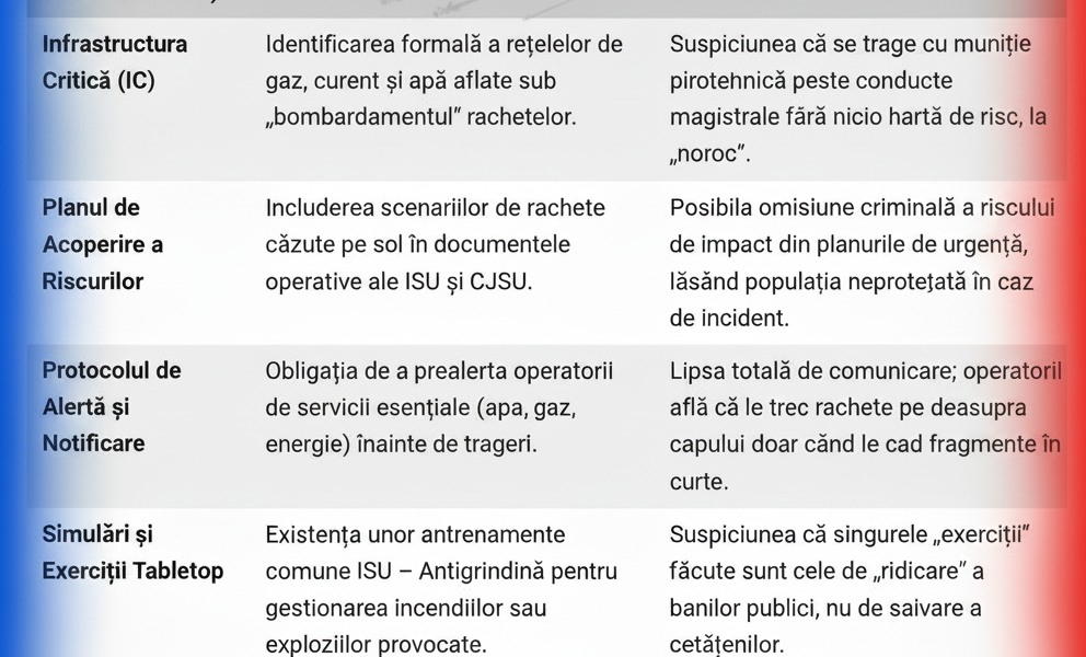 | Infrastructura Critică (IC) | Identificarea formală a rețelelor de gaz, curent și apă aflate sub „bombardamentul” rachetelor. | Suspiciunea că se trage cu muniție pirotehnică peste conducte magistrale fără nicio hartă de risc, la „noroc”. |