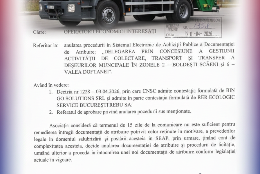 Cireașa de pe muntele de gunoi a fost pusă chiar ieri, 20 aprilie 2026, printr-un document oficial care probează „noaptea minții” administrative. Directorul executiv al ADI Prahova, Silviu-Cristian Voicu, a semnat actul prin care procedura de licitație pentru Zonele 2 și 6 este anulată definitiv. Motivul? O recunoaștere penibilă a propriei neputințe: ADI consideră că termenul de 15 zile impus de CNSC prin Decizia nr. 1228/03.04.2026 nu este „suficient pentru remedierea întregii documentații”.