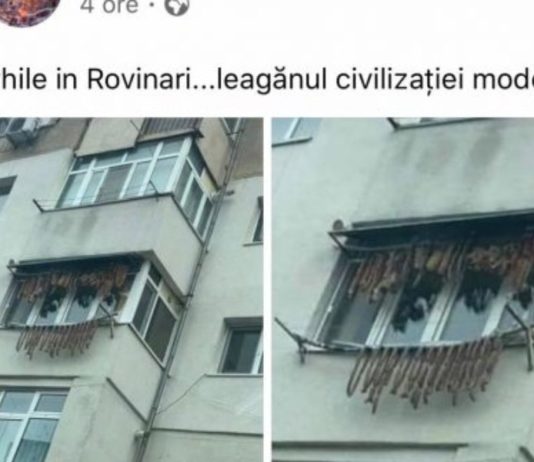 Proprietarii unui apartament din Rovinari, județul Gorj au pus la uscat cârnații și slănina, pe sârme, pe balcon și în afara balconului. Imaginile postate de trecători pe rețelele sociale au devenit virale. „Meanwhile în Rovinari… leagănul civilizației moderne”, a scris internautul care a postat imaginile pe Facebook. (Alexandru Visan).