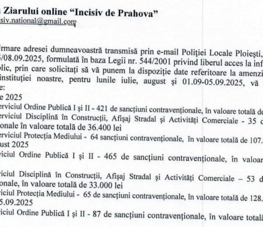 Un răspuns oficial al Poliției Locale Ploiești la solicitarea ziarului „Incisiv de Prahova” aruncă o lumină asupra activității de sancționare din cadrul instituției. Datele, care acoperă lunile iulie și august 2025, precum și primele zile din septembrie, dezvăluie disparități semnificative între servicii, atât în...