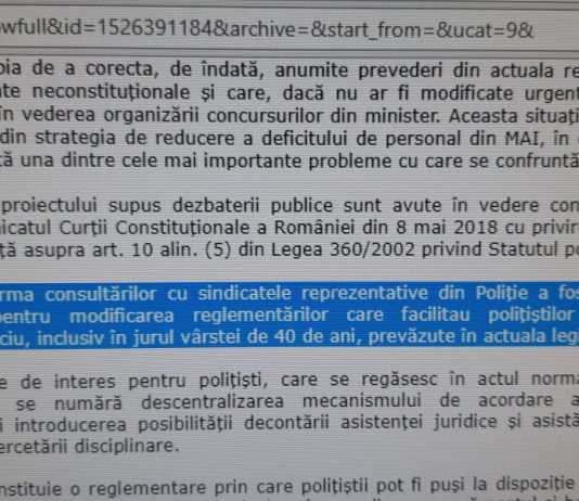 În data de 15 mai 2018, M.A.I. posta pompos pe sitte-ul instituției comunicatul referitor la modificarea statutului polițistului propusă de instituție prin ordonanță de urgență (cu încălcarea art. 73, 115 alin.(6),130 și 131 Constituție) susținându-se în acest comunicat, cităm: „De asemenea, în urma consultărilor cu sindicatele reprezentative din Poliție...