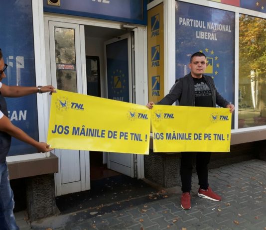 Ședință cu protest, ieri, la sediul organizației PNL Prahova. Mai mulți membri ai organizației de tineret au fost radiați. Înainte de începerea ședinței tinerii liberali au afișat un banner cu mesajul ,,Jos mâinile de pe TNL".