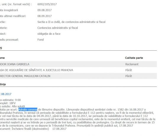 O prahoveancă a fost nevoită să dea în judecată Casa de Asigurări de Sănătate Prahova pentru a-i salva viața copilului din pântec, care s-a născut cu o malformație gravă a inimii. Funcționarii CAS Prahova au refuzat eliberarea formularului E 112 necesar unei intervenții chirurgicale la un spital din Germania,...